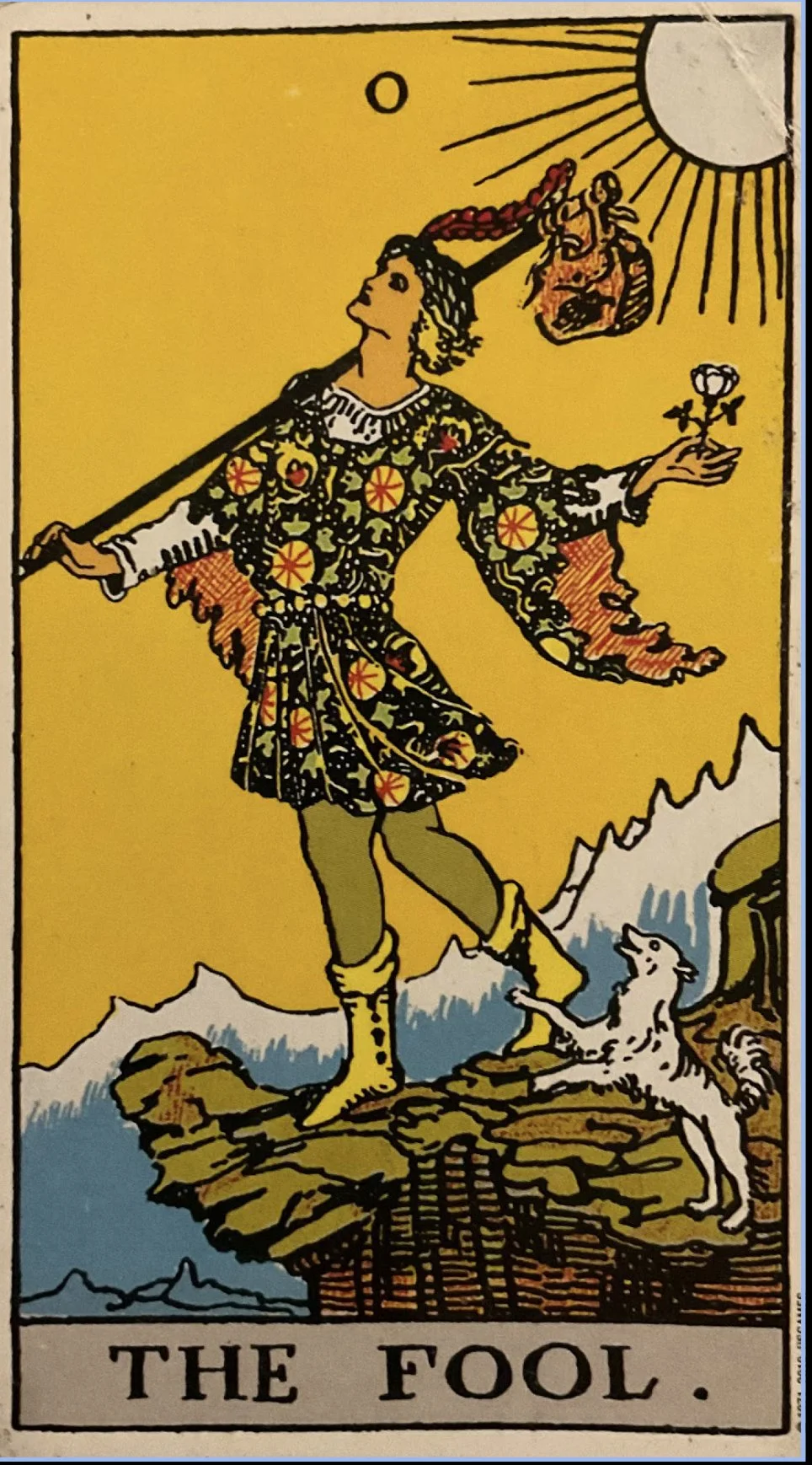 Even the The Fools clothes have specific meanings. His white undergarment represents inner wisdom and the purity within. The red in his robes represent fire and passion. The black outer garment represents ignorance - all that he has yet to learn. And the symbols upon the coat are said to be either fruits or spirit wheels, both representing life. His yellow boots symbolize confidence as he steps forward into the new adventure.
